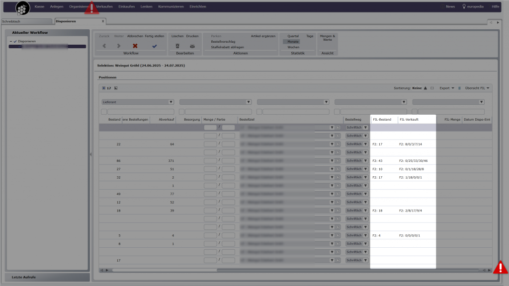 Über die „Übersicht Filialen“ sehen Sie in Ihrer Dispositionsliste nicht nur die aktuellen bestände, sondern auch die Abverkäufe der Filialen. Das Intervall für die Abverkäufe können Sie wie gewohnt über die obere Menüleiste steuern, um eine tages-, wochen-, monats- oder quartals-genaue Information zu erhalten.