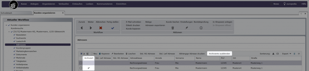 Der Button wechselt dann automatisch die Funktion in „Archivierte ausblenden“. Archivierte adressen des Kunden erkennen Sie am Häkchen in der Spalte „Archiviert“: