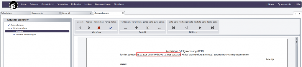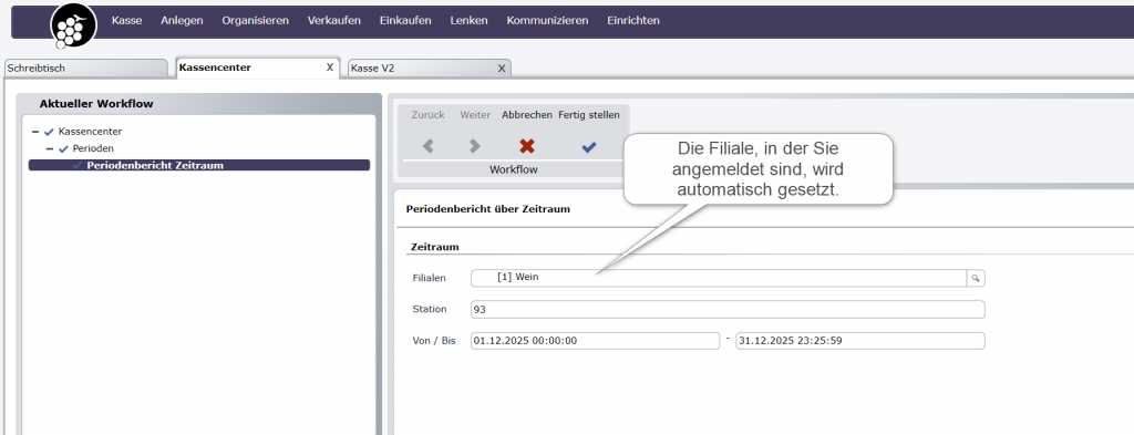 Wenn Sie mehrere Filialen in den Zeitraum-Bericht einbeziehen oder den Bericht für eine Filiale erstellen möchten, in der Sie gerade nicht angemeldet sind, ändern Sie bitte die Filialauswahl.