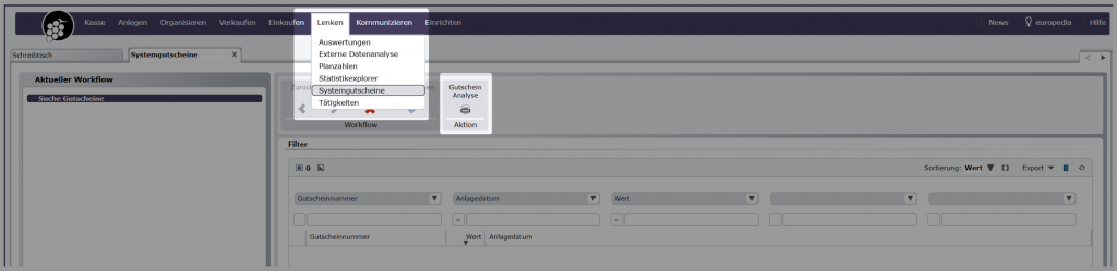 Unter Lenken – Systemgutscheine finden Sie nun die Gutschein-Analyse. Über diese können Sie nicht nur alle Gutschein-Buchungen für einen Zeitraum abfragen und einsehen, über welche Belege die Gutscheine erzeugt / eingelöst wurden…