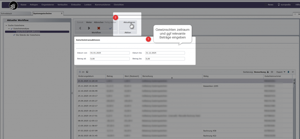 …sondern auch historische Gutscheinstände ermitteln. Wenn Sie für Ihren Steuerberater / den Jahresabschluss eine Übersicht zu einem Stichtag (z. B. zum 31.12.2025) benötigen, können Sie diese nun ganz einfach ermitteln. Bitte beachten sie, dass die Auswertung immer zum gewünschten Datum „um 0:00 Uhr“ erfolgt – für den exakten Stand zum Jahresende geben Sie bitte als Stichtag den 1.1. ein.