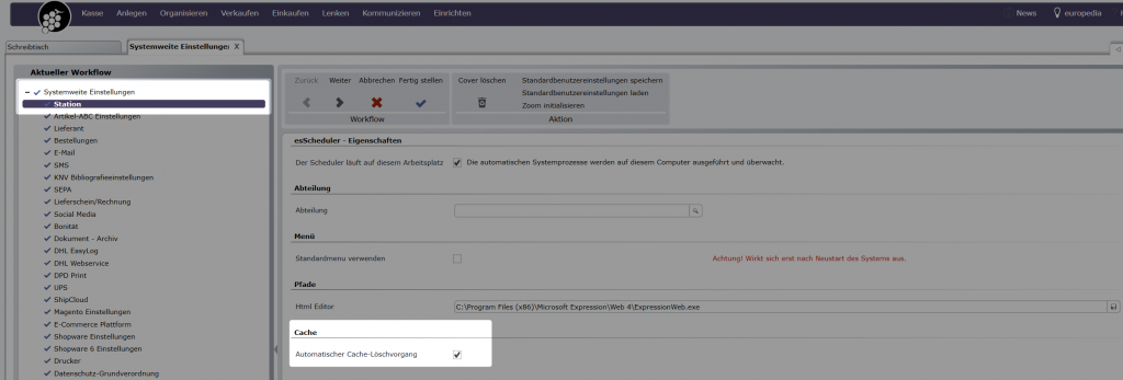 Zum Aktivieren öffnen Sie die Administration (unter Einrichten) – Systemweite Einstellungen – Station. Setzen Sie ein Häkchen in die Checkbox „Automatischer Cache-Löschvorgang“. Bitte beachten Sie, dass diese Einstellungen nur für den jeweiligen PC gilt und erst beim nächsten Neustart aktiv ist.